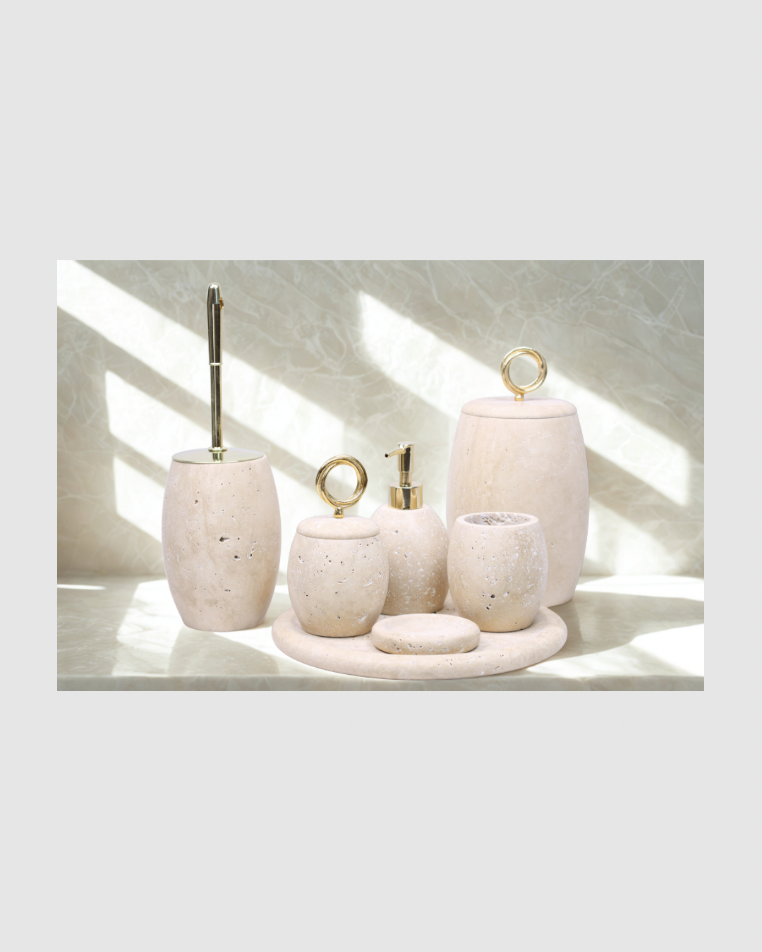 Travertin Luxe – 7-teiliges Badset aus Naturstein & Metall