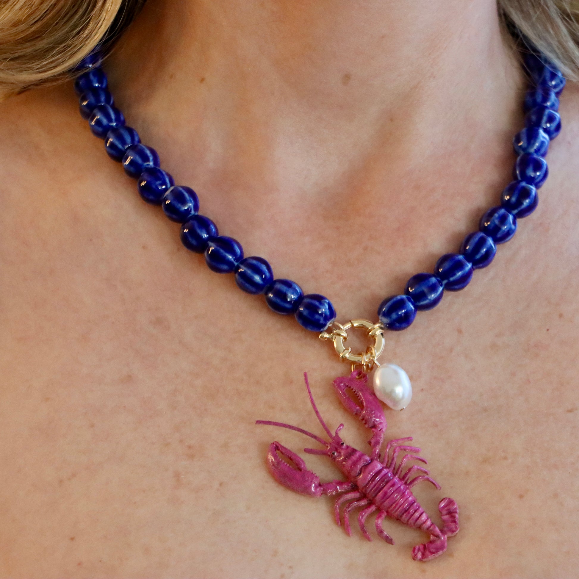 • Lobster-Anhänger in kräftigem Pink mit schimmernder Perle – ein humorvolles Detail mit Charme.