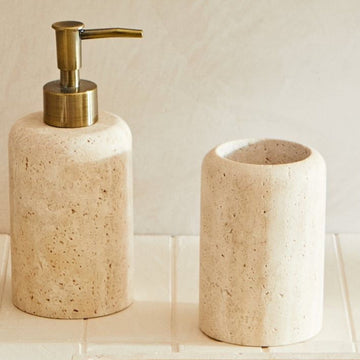 Unsere Bad Sets aus Marmor und Travertin bringen luxuriöse Eleganz in Ihr Badezimmer. Mit stilvollen Accessoires wie Seifenschalen, Zahnputzbechern und Ablagen aus diesen edlen Natursteinen schaffen Sie eine entspannende und raffinierte Atmosphäre. Die zeitlose Schönheit der Steine kombiniert sich perfekt mit der Funktionalität, um Ihr Badezimmer zu einem Ort der Ruhe und des Komforts zu machen.