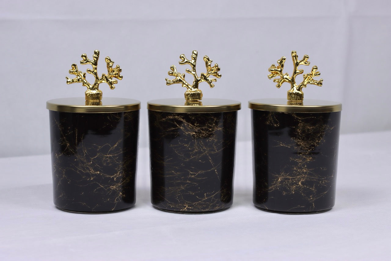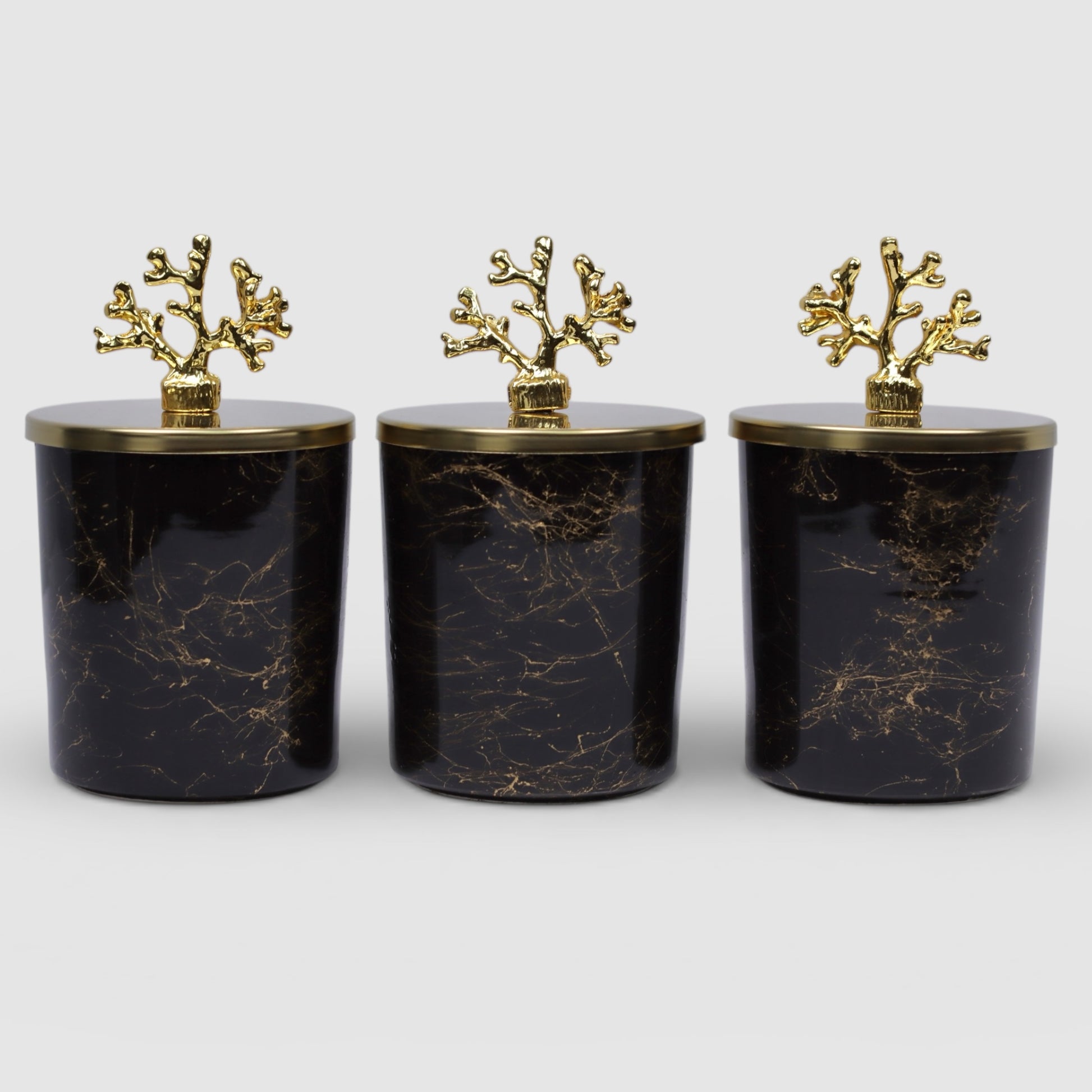 Das „Coral Luxe“ Set bringt pure Raffinesse in dein Zuhause. Die drei edlen Zylinderdosen aus handgefertigter Keramik beeindrucken durch ihre tiefschwarze Oberfläche mit feiner goldener Marmorierung – inspiriert von luxuriösem Naturstein.