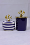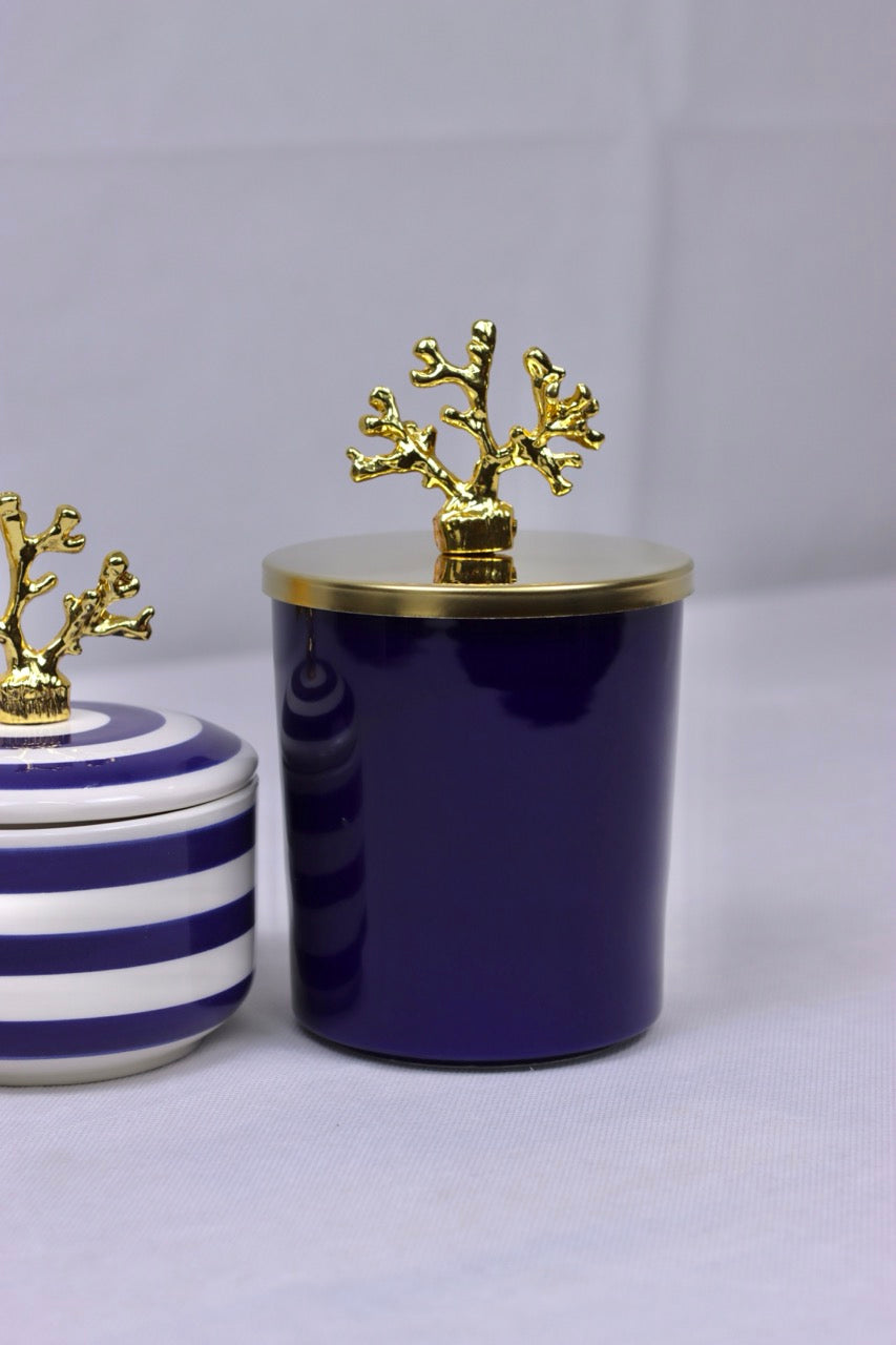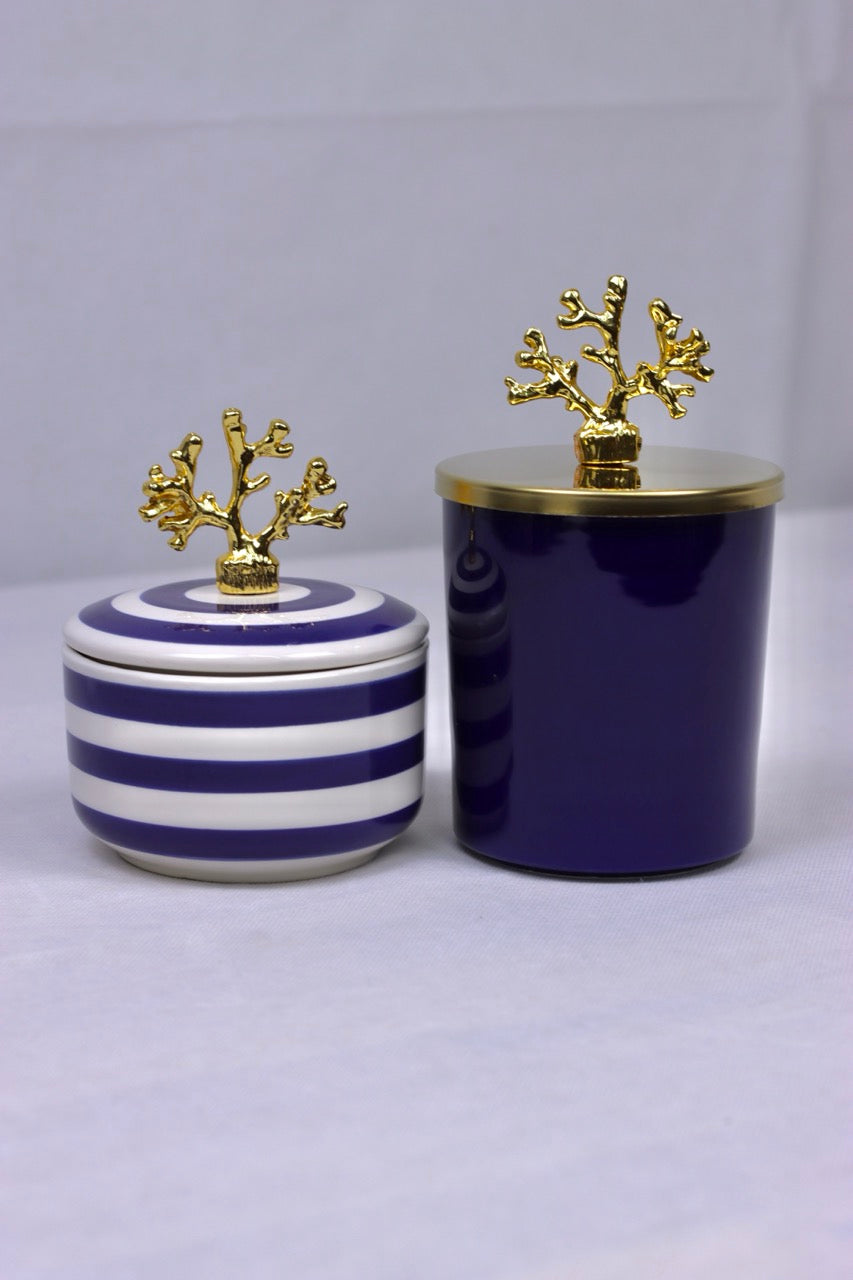 Das „Coralia Duo“ ist eine stilvolle Hommage an den Ozean – modern interpretiert. Dieses 2er-Set besteht aus zwei hochwertigen Keramikdosen mit aufwendig gearbeiteten Deckeln, die von einer fein modellierten Koralle aus goldfarben verchromtem Metall gekrönt werden.
