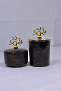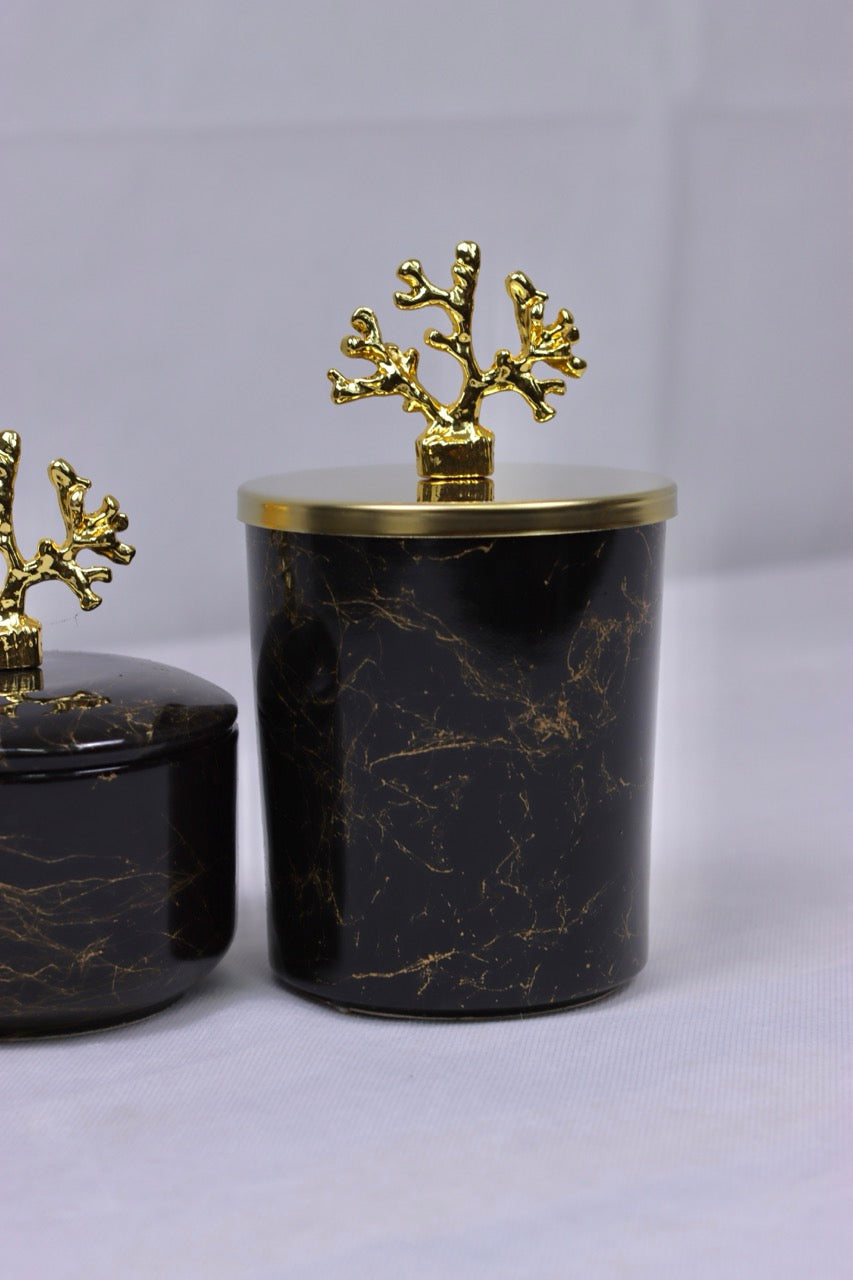 Die klare, zylindrische Form der Gefäße betont das Spiel zwischen glänzender Oberfläche und dem organisch geformten Griff. Ideal als dekoratives Element auf Kommoden, Sideboards oder im Badezimmer – zum Aufbewahren kleiner Gegenstände oder einfach als Statement-Piece.