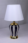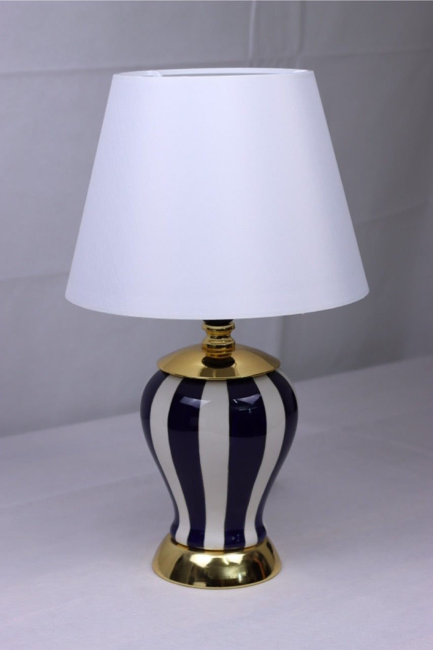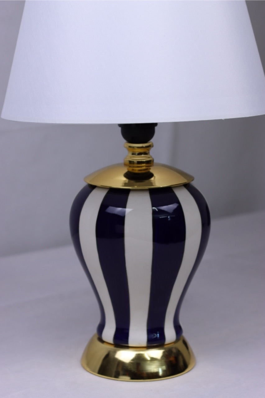 Die „Côte d’Azur“ Tischlampen bringen französisches Küstenflair direkt in Ihr Zuhause. Mit ihrem edlen Fuss in dunkelblauer und cremefarbener Streifenoptik erinnern sie an die klassische Riviera-Ästhetik. Die goldfarbenen Metallakzente an Fuss und Lampenfassung sorgen für eine luxuriöse Note, während der schlichte weiße Schirm das Design modern ausbalanciert.
