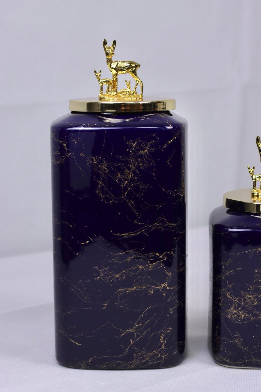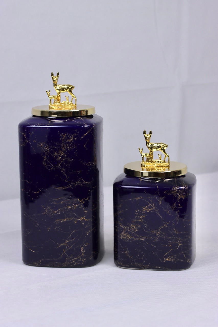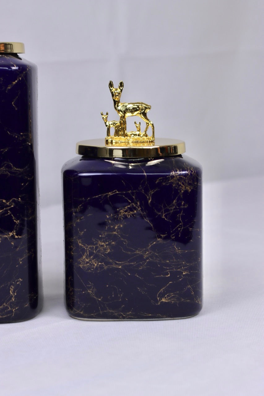 Anmutig, still und voller Naturverbundenheit – das „Forest Grace“ Keramik-Dosenset vereint elegantes Design mit liebevollen Details. Die tiefblaue, hochglänzende Oberfläche mit zarter Goldmarmorierung erinnert an einen nächtlichen Waldboden im Mondlicht.