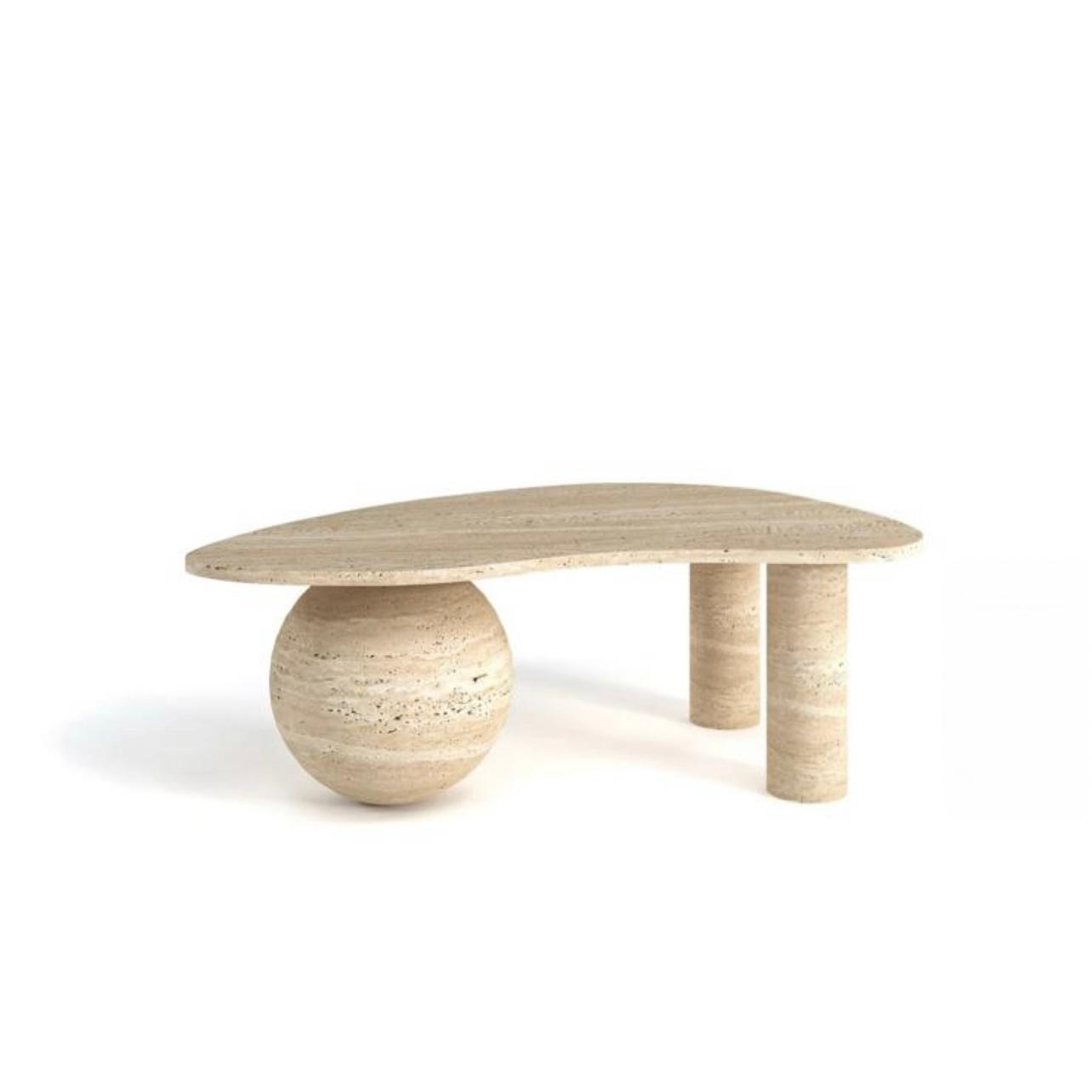 Der Couchtisch “Gaia” verbindet skulpturale Ästhetik mit der kraftvollen Ausstrahlung von Naturstein. Die organisch geformte Tischplatte ruht auf zwei zylindrischen Stützen und einer markanten Travertin-Kugel – ein einzigartiger Material- und Formkontrast, der moderne Wohnräume auf das nächste Level hebt.