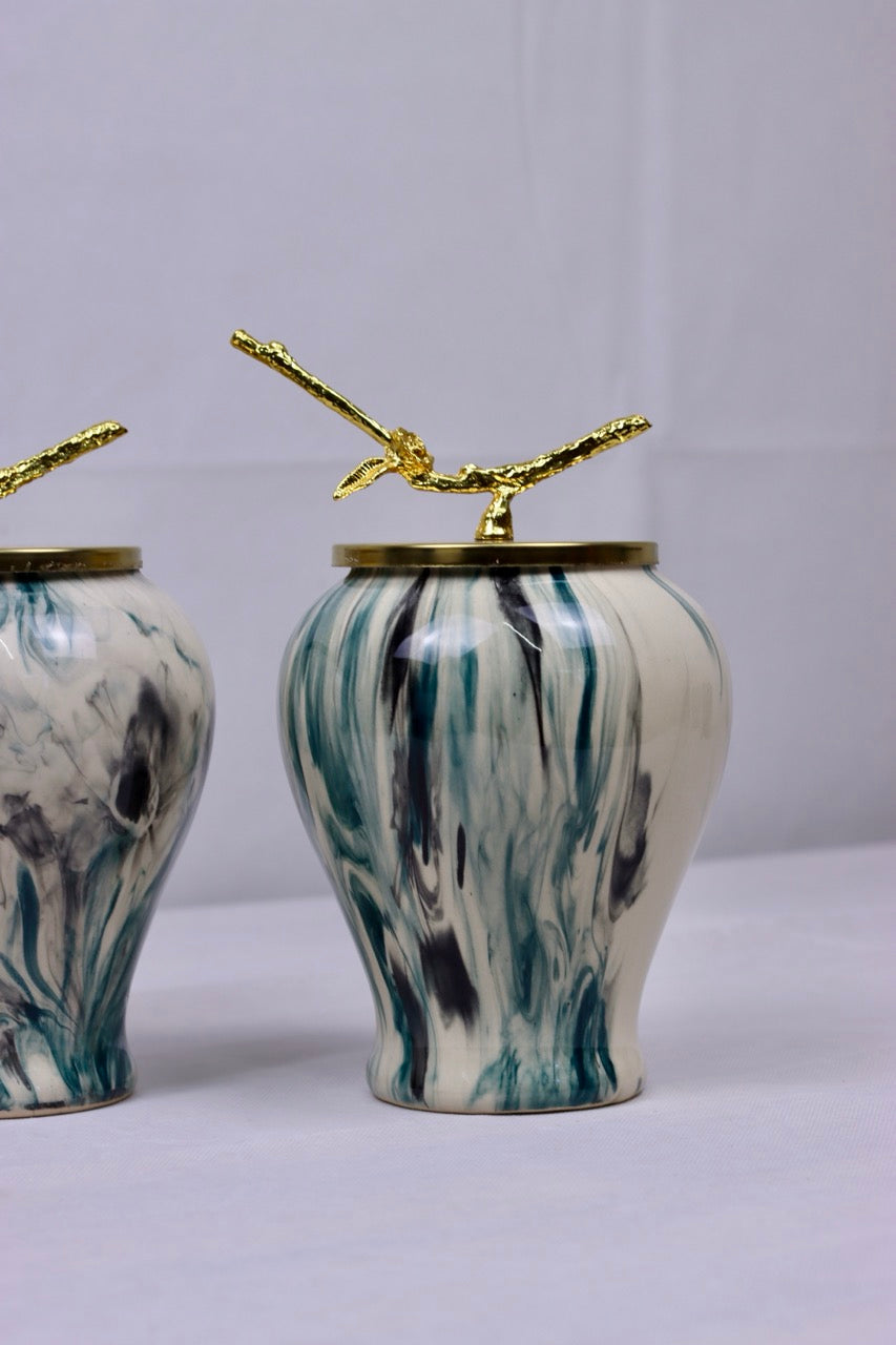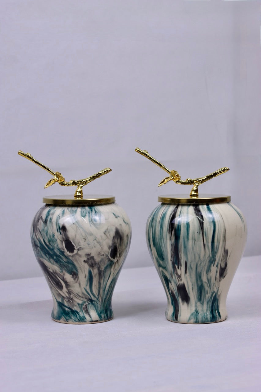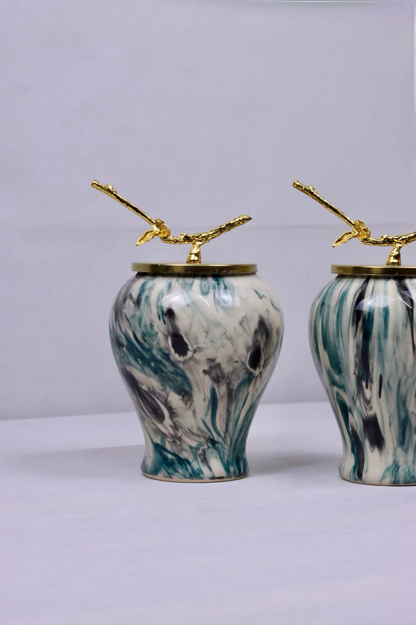 Die „Golden Duo“ Vasen bringen modernes Design und kunstvolle Handarbeit in stilvoller Harmonie zusammen. Handgefertigt und glasiert, kombiniert jede Vase klassische Formgebung mit einem luxuriösen Deckel – verziert durch einen fein modellierten Zweiggriff in Gold oder Silber.