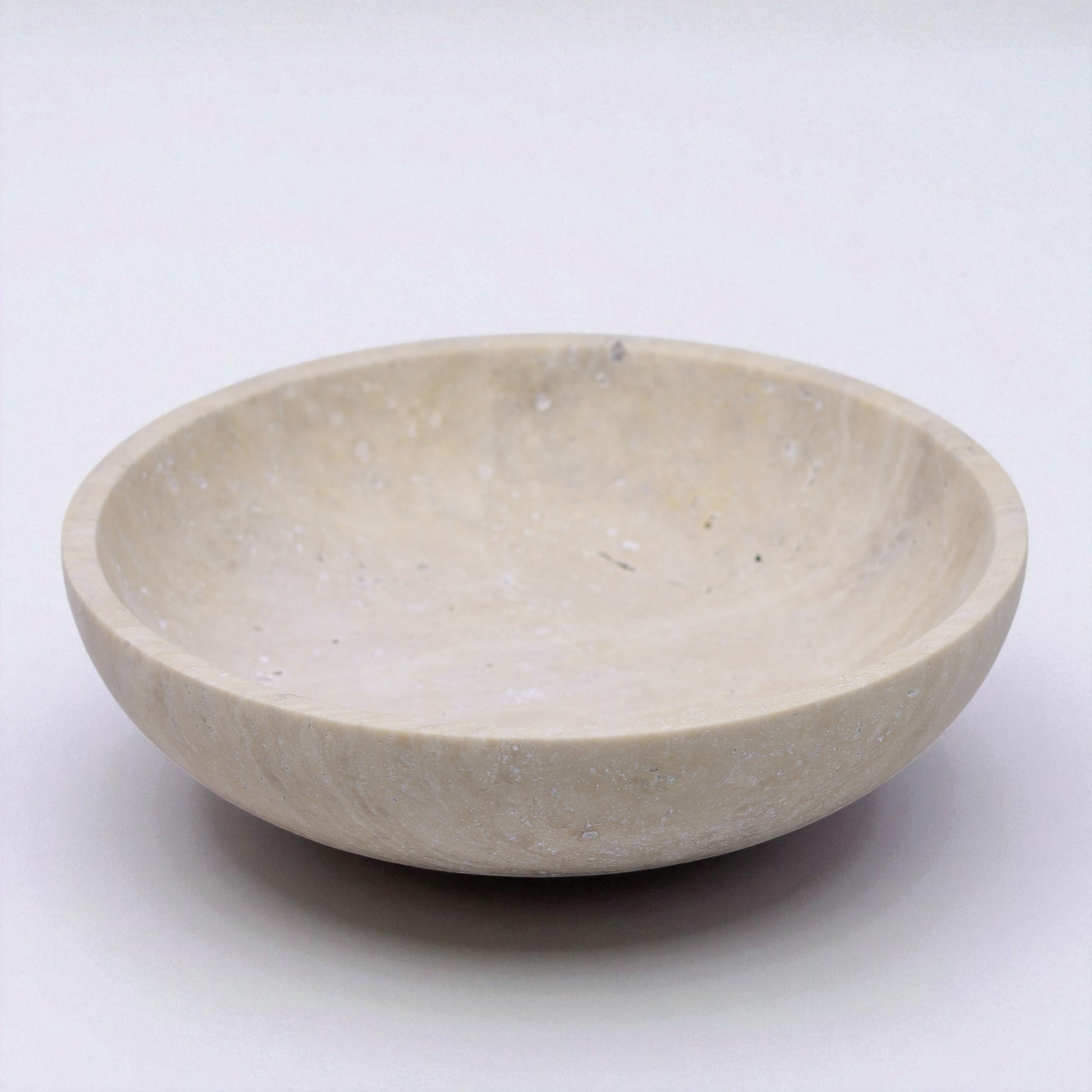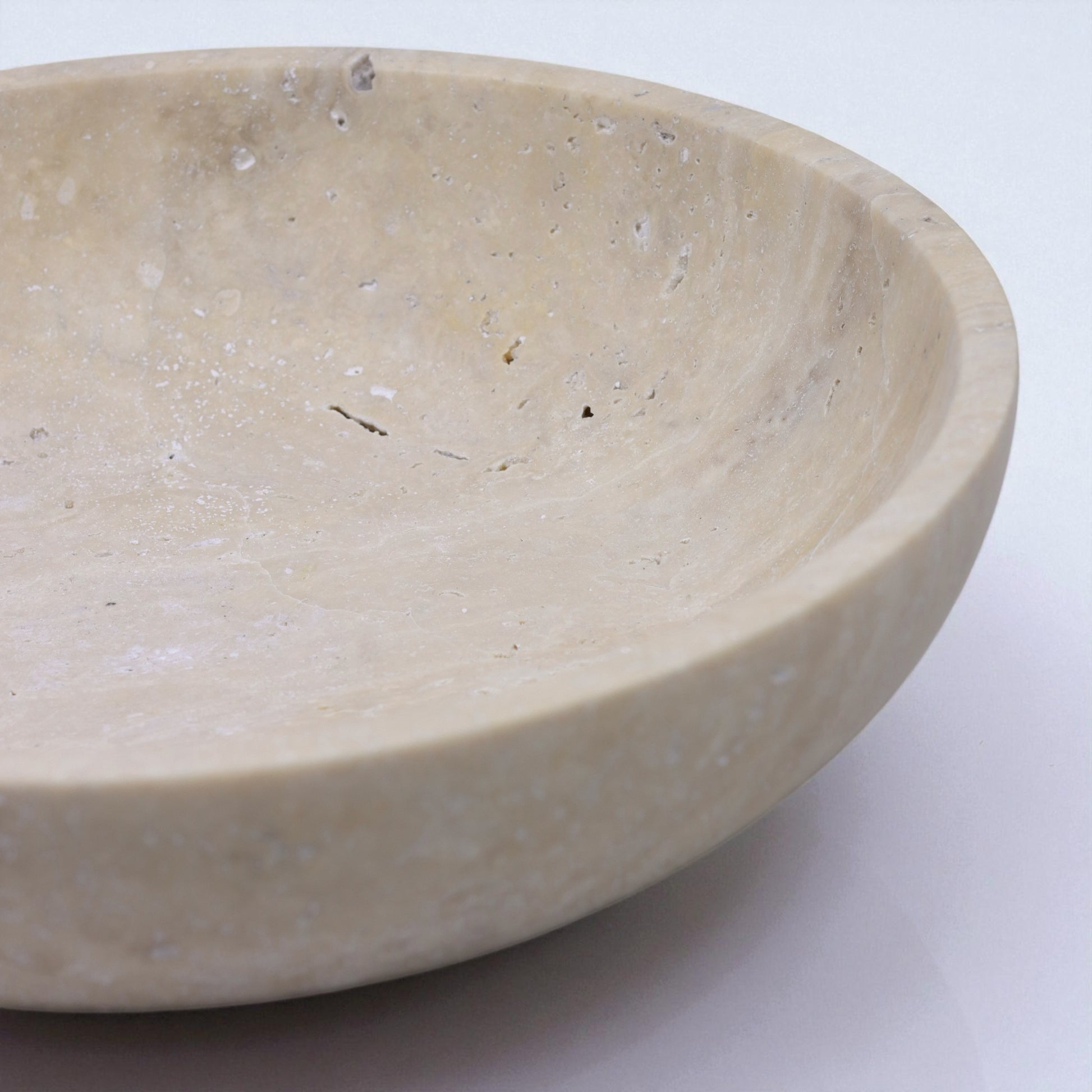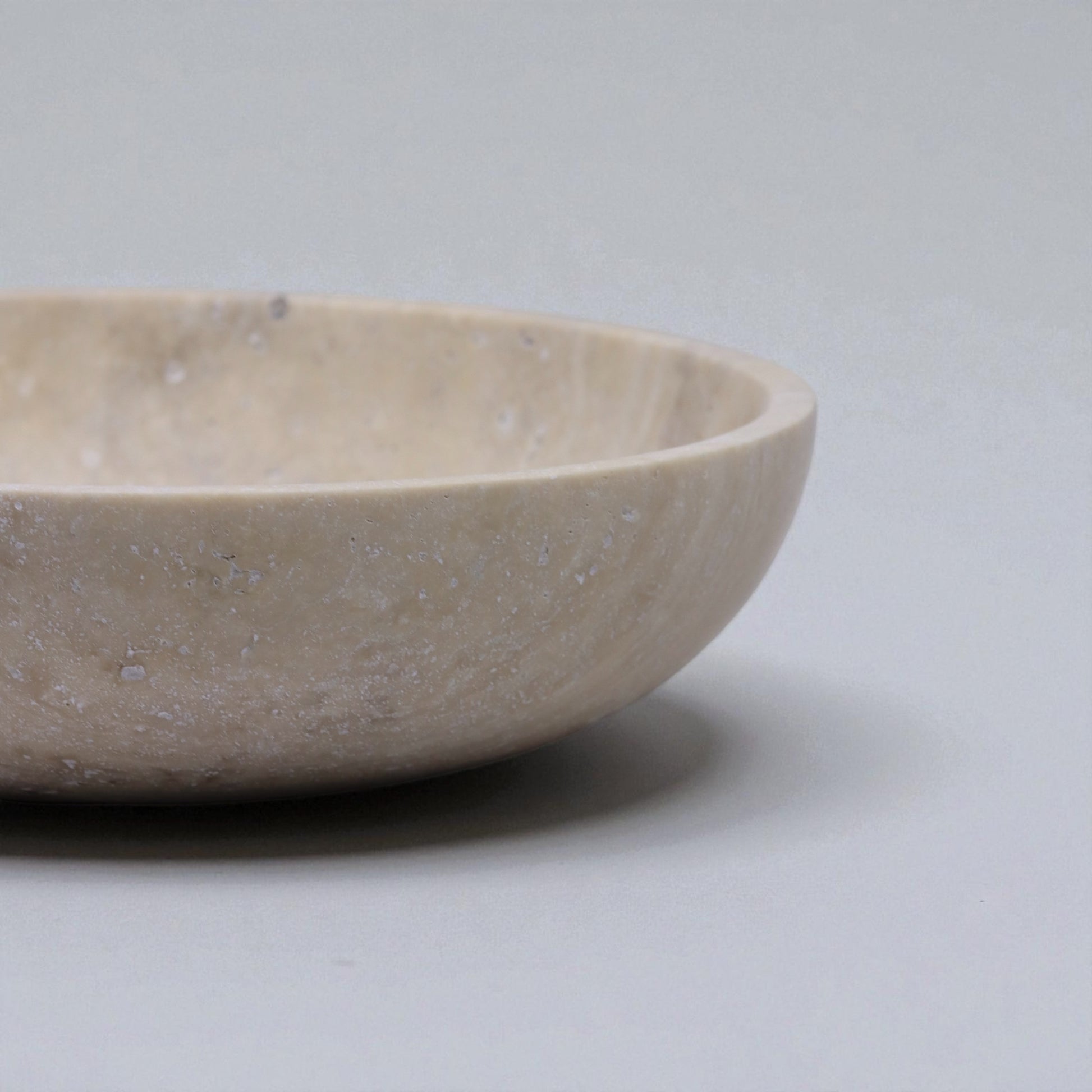 Die Luno Terra Schale bringt die natürliche Schönheit von Travertin in eine schlichte, ausgewogene Form. Ihre offenporige Struktur und erdige Farbigkeit machen sie zum perfekten Objekt für alle, die reduzierte, organische Ästhetik schätzen. Ideal für trockene Inhalte oder als dekorativer Mittelpunkt auf Tisch oder Konsole. Nicht für Flüssigkeiten geeignet.