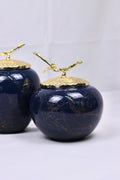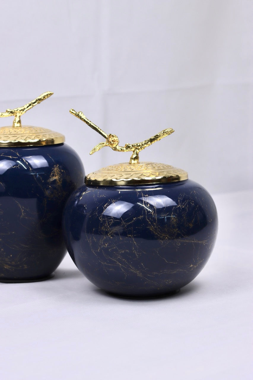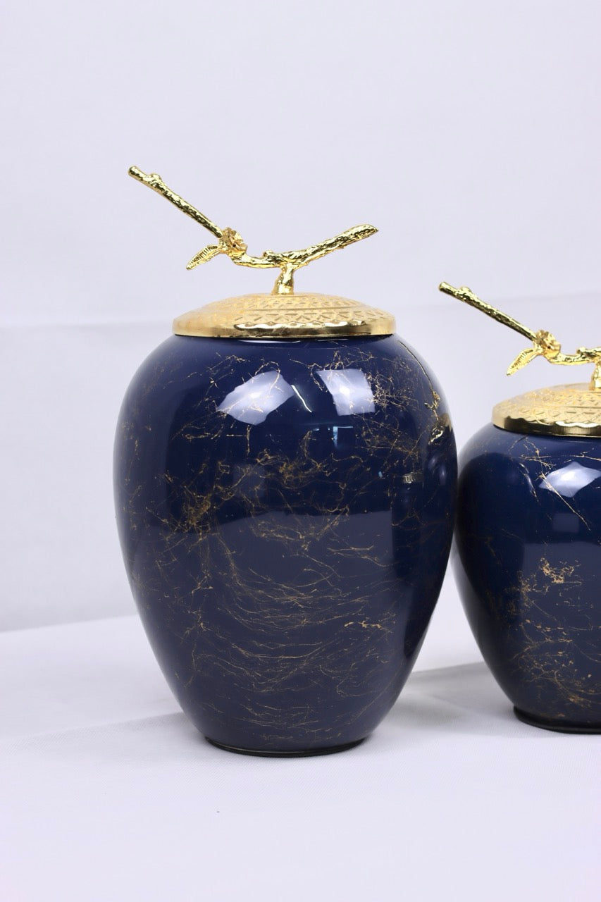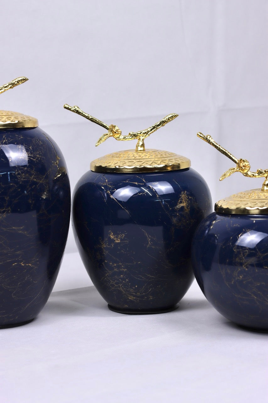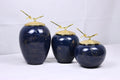 Eleganz trifft Handwerkskunst: Das „Midnight Gold“ Keramik 3-er Dekoset besticht durch seine tiefblaue, glänzende Oberfläche, durchzogen von feinen goldenen Maserungen, die an funkelnde Sternspuren am Nachthimmel erinnern.