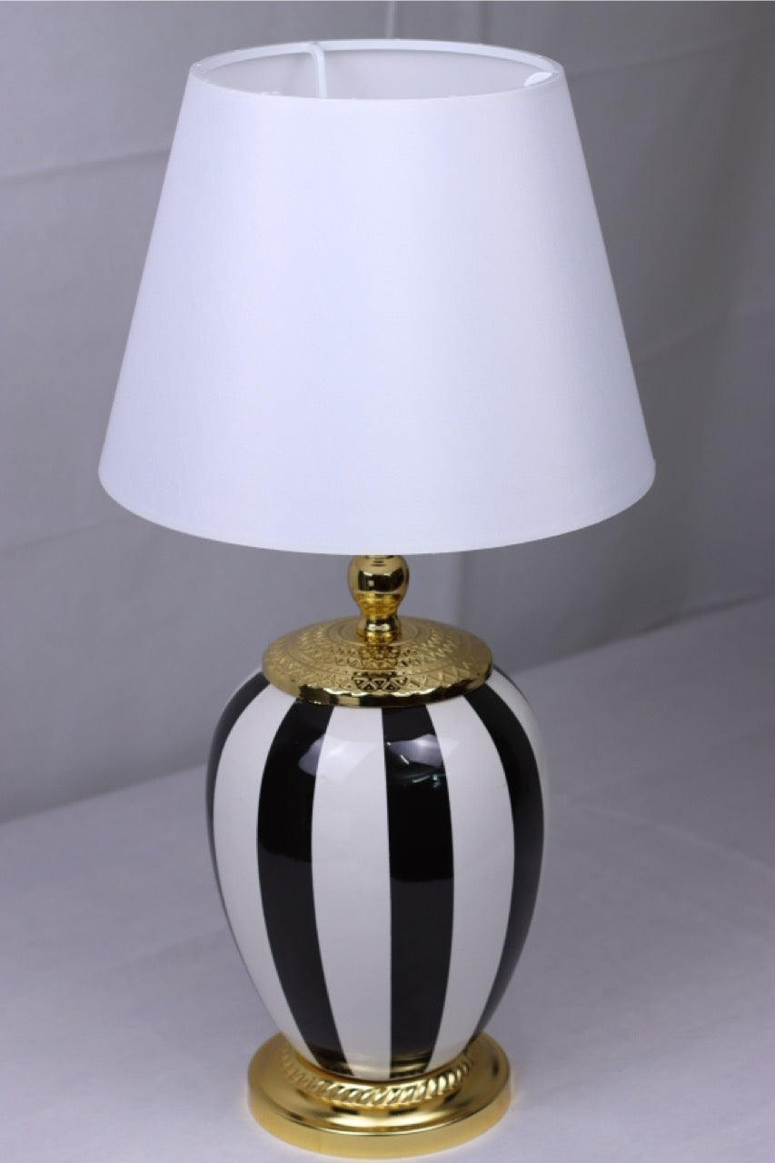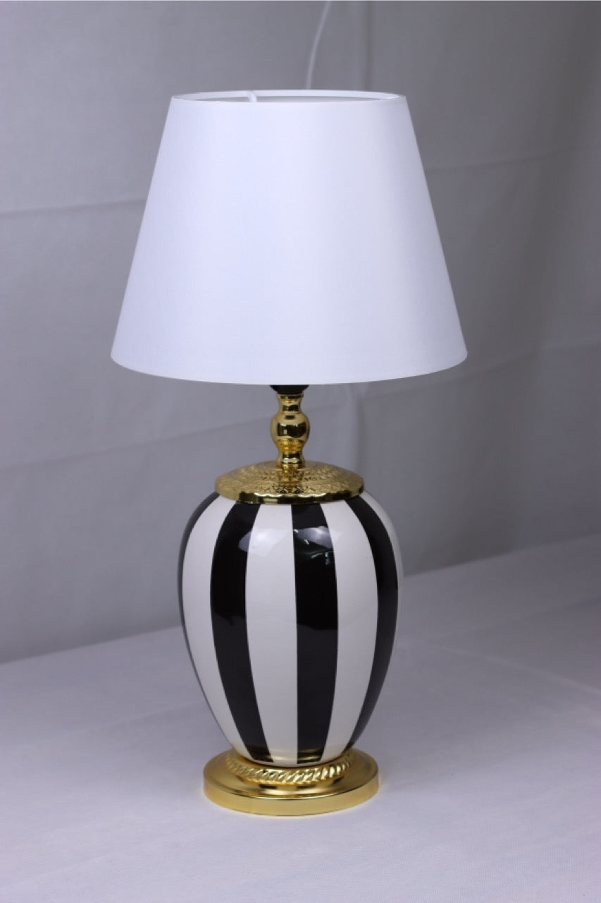 Mit der „Monaco Noir“ Tischlampe zieht ein Hauch von Art-Déco-Eleganz in Ihr Zuhause ein. Das kontrastreiche Design aus tiefschwarzen und elfenbeinweissen Streifen wird durch opulente goldene Details auf der Basis und am Hals vollendet. Der klassische weisse Schirm bringt Ruhe ins Gesamtbild und macht diese Lampe zu einem harmonischen Highlight – ob im Schlafzimmer, auf Sideboards oder in stilvollen Eingangsbereichen.