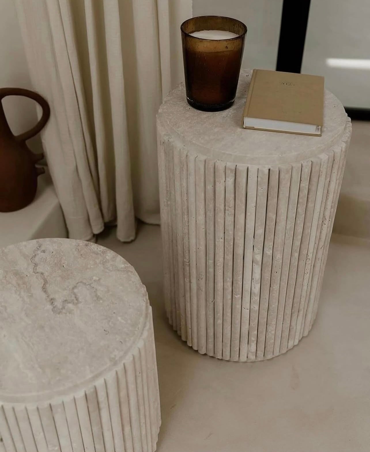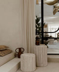 Das 2-teilige Beistelltisch-Set “Scala” vereint moderne Handwerkskunst mit mediterraner Natürlichkeit. Die vertikale Rillenstruktur der zylindrischen Travertin-Tische verleiht dem Set eine architektonische Tiefe und spannende Lichtwirkung. Inspiriert von klassischen Säulen, bringen die Tische klare Struktur und visuelle Leichtigkeit in moderne Wohnräume.