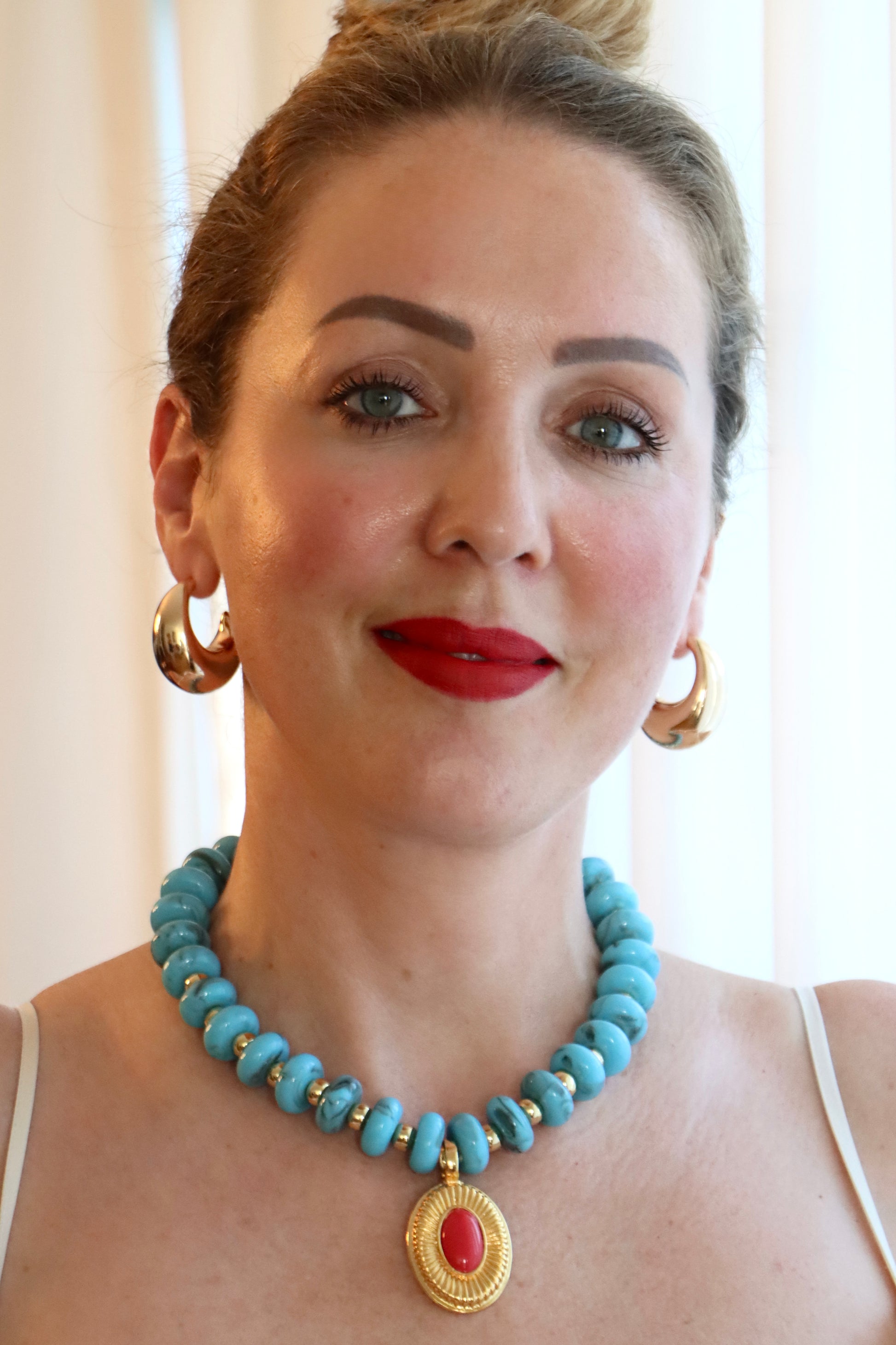 • Türkis & Gold: Frisch, lebendig und sommerlich – mit marmorierten Türkis-Perlen, goldenen Akzenten und einem roten, ovalen Medaillon als Zentrum.