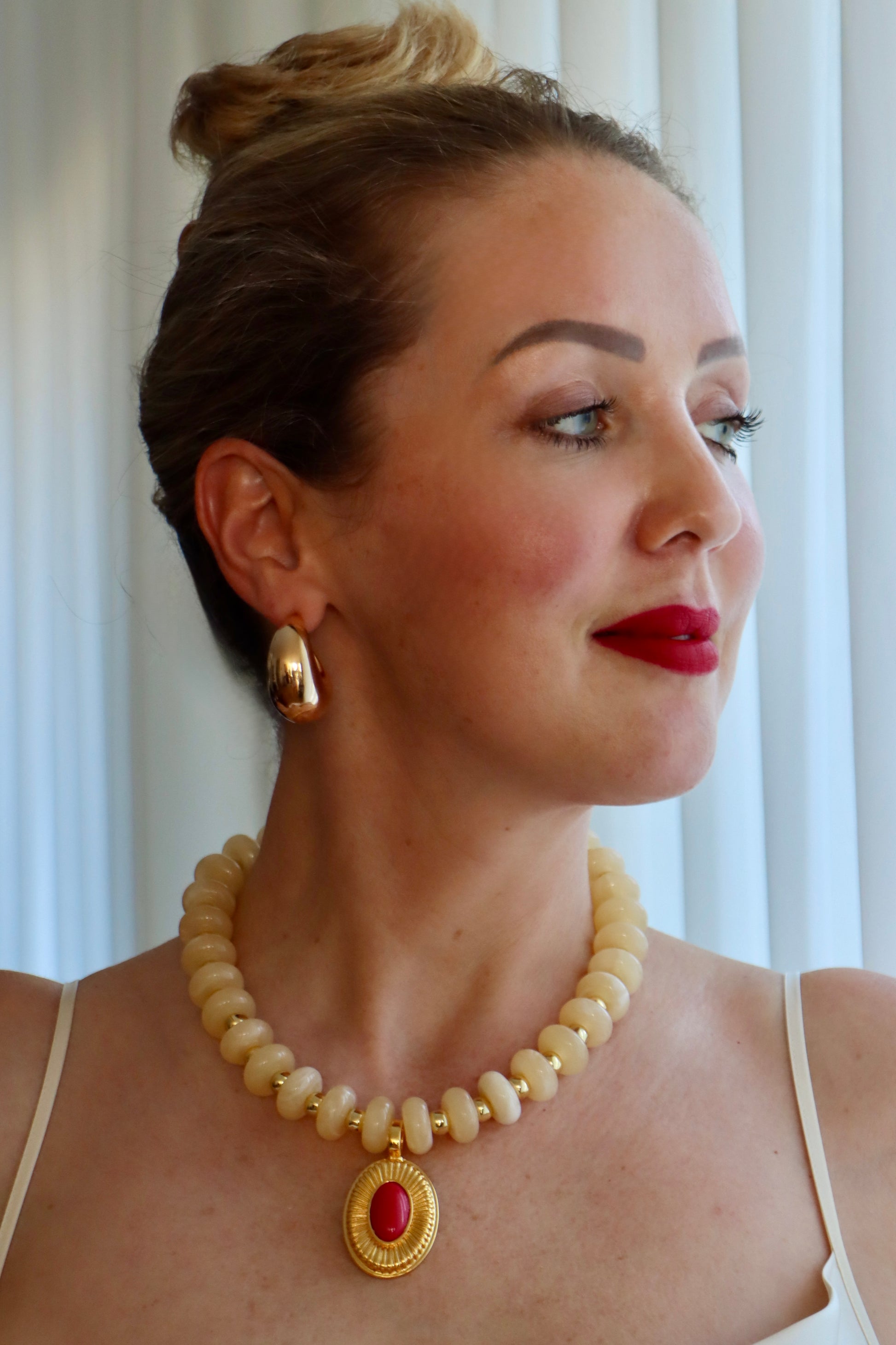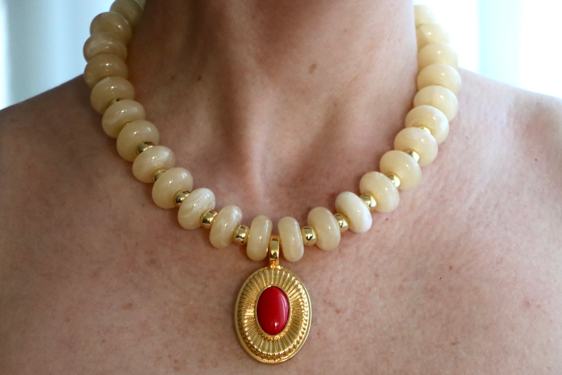 Beide Varianten sind mit dem markanten vergoldeten Medaillon-Anhänger mit rotem Cabochon versehen – inspiriert von antiken Amuletten und neu interpretiert für den heutigen Look.