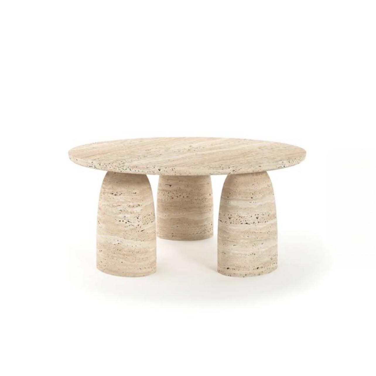 Der Couchtisch “Solaro” vereint die warme Ausstrahlung von echtem Travertin mit einem ikonischen Design. Drei massiv gearbeitete Säulen tragen eine großzügige, runde Tischplatte und sorgen für ein harmonisches Zusammenspiel von Form, Stabilität und natürlicher Struktur.