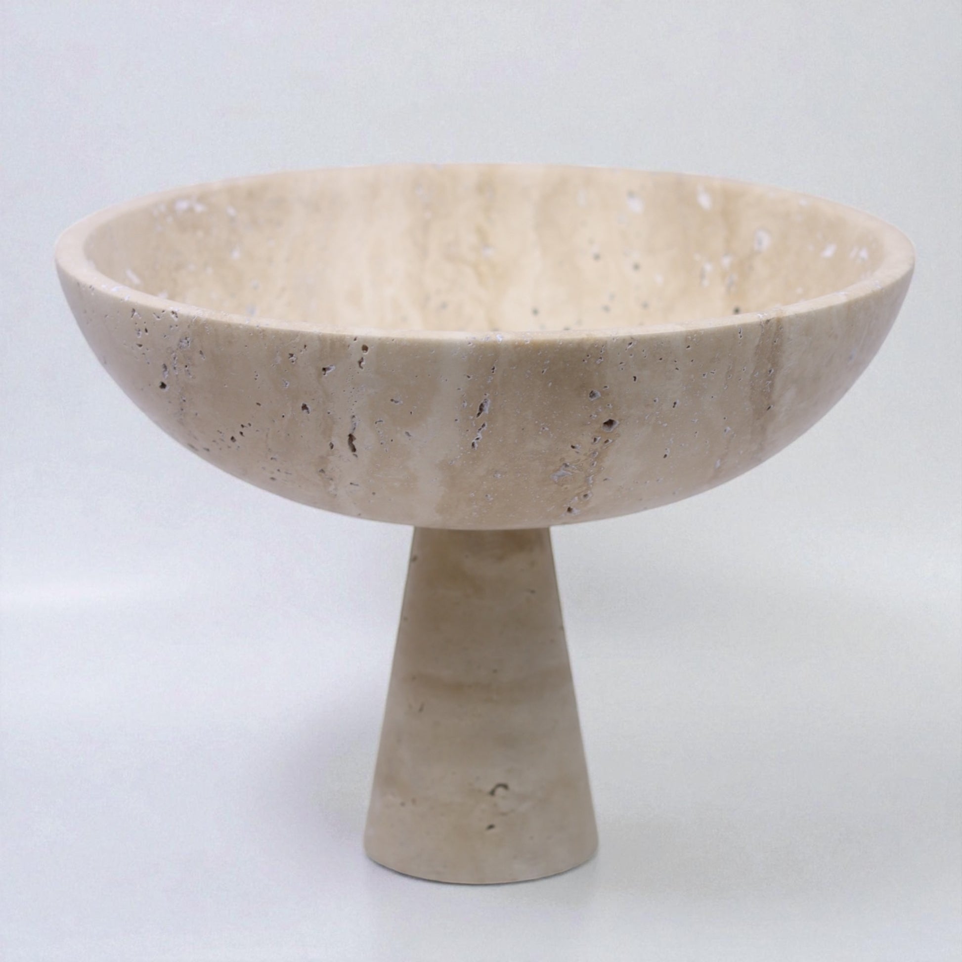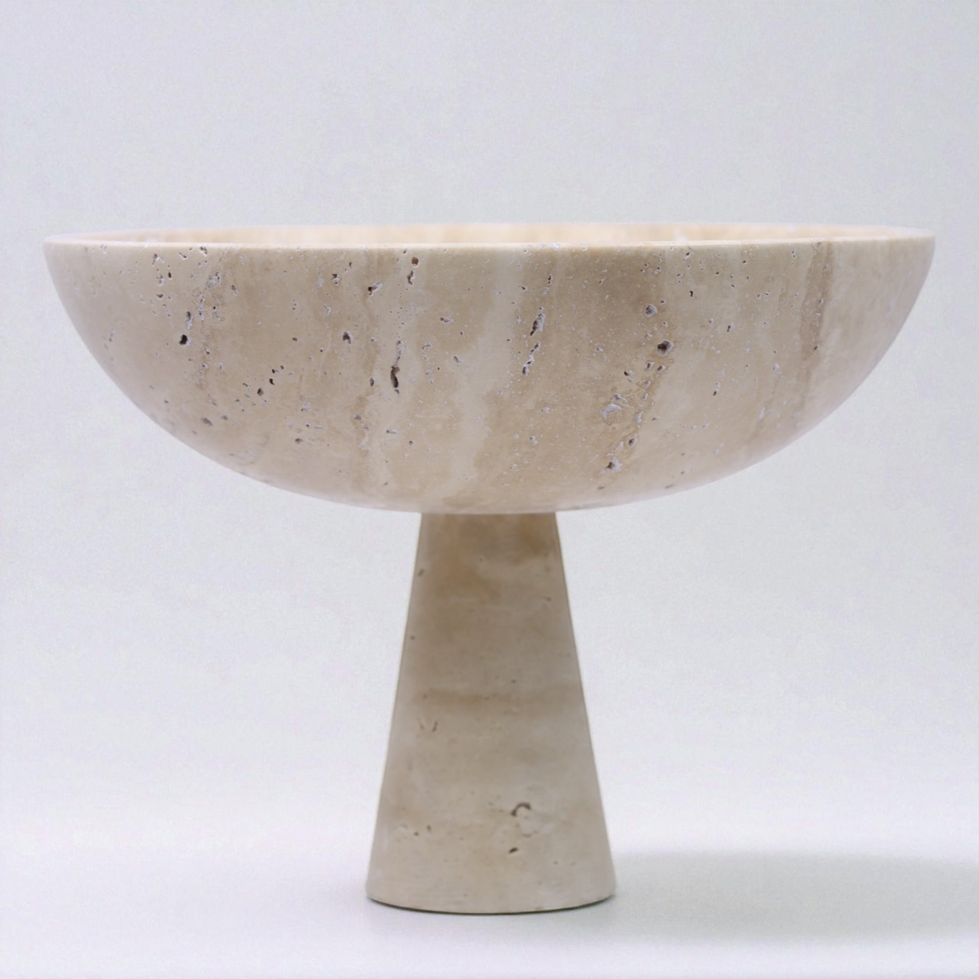 Die Schale Solon Terra vereint klassische Formensprache mit der natürlichen Eleganz von Travertin. Komplett aus dem charaktervollen Kalkstein gefertigt, ruht die sanft gewölbte Schale auf einem konischen Fuß, der ihr eine skulpturale Leichtigkeit verleiht. Solon ist ein Ausdruck ruhiger Stärke – perfekt als zentrales Objekt auf einem Tisch oder als edles Gefäß für besondere Inhalte.