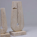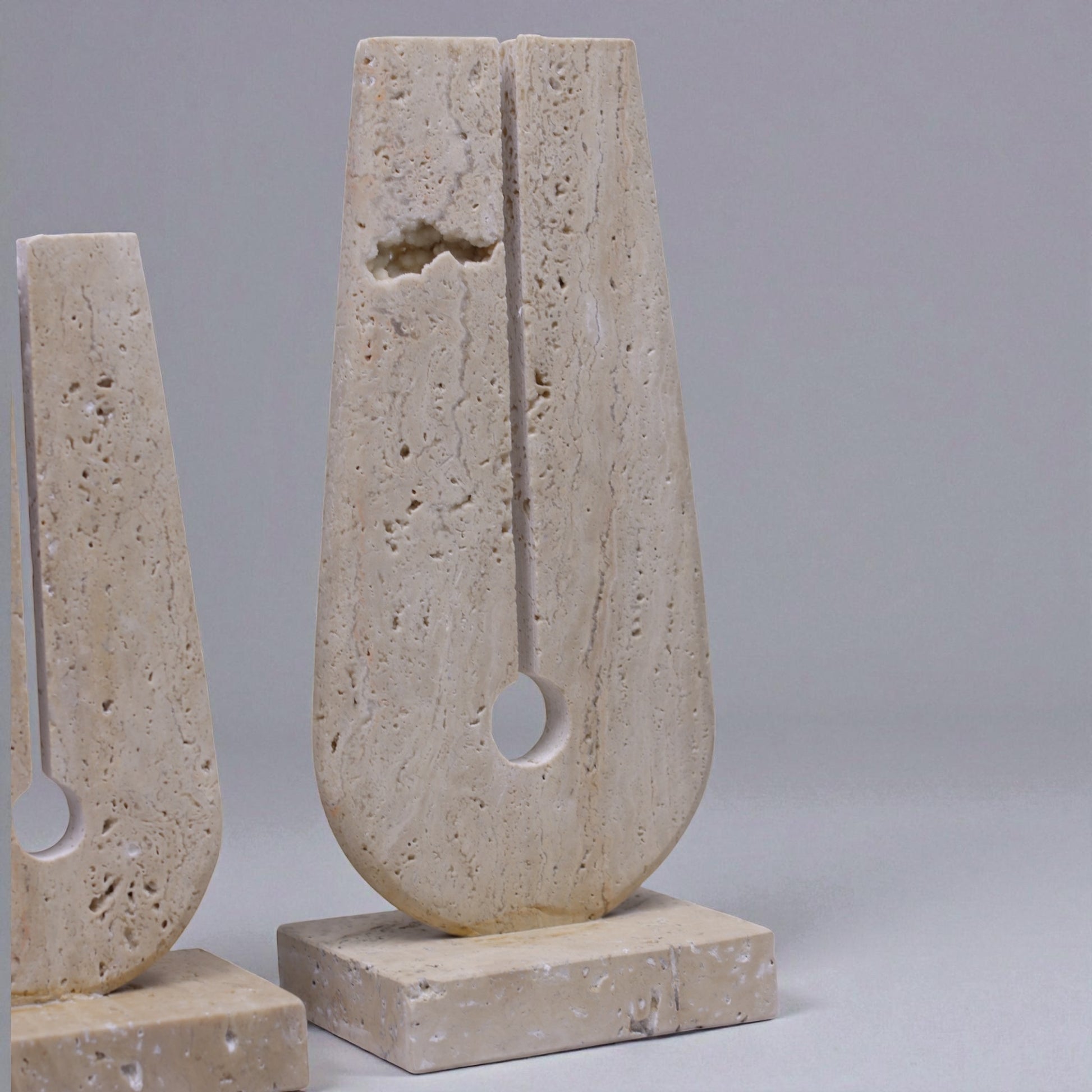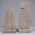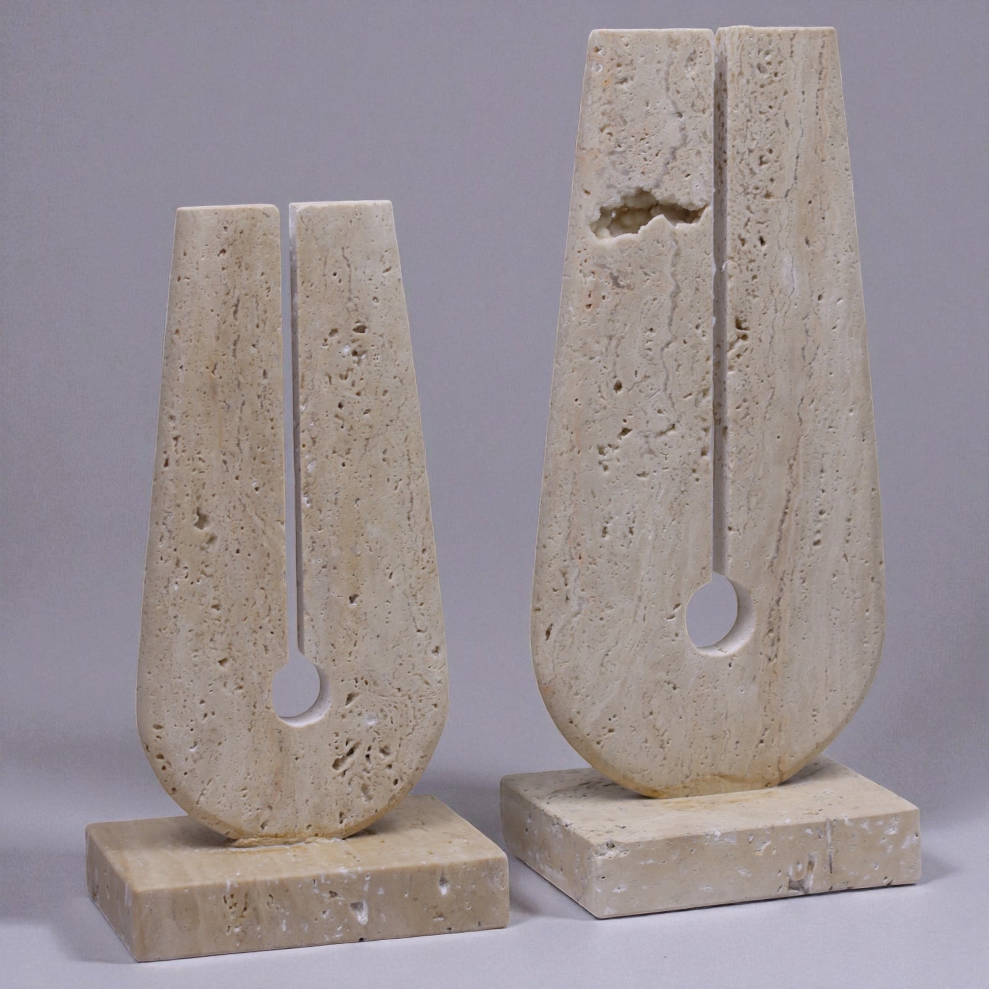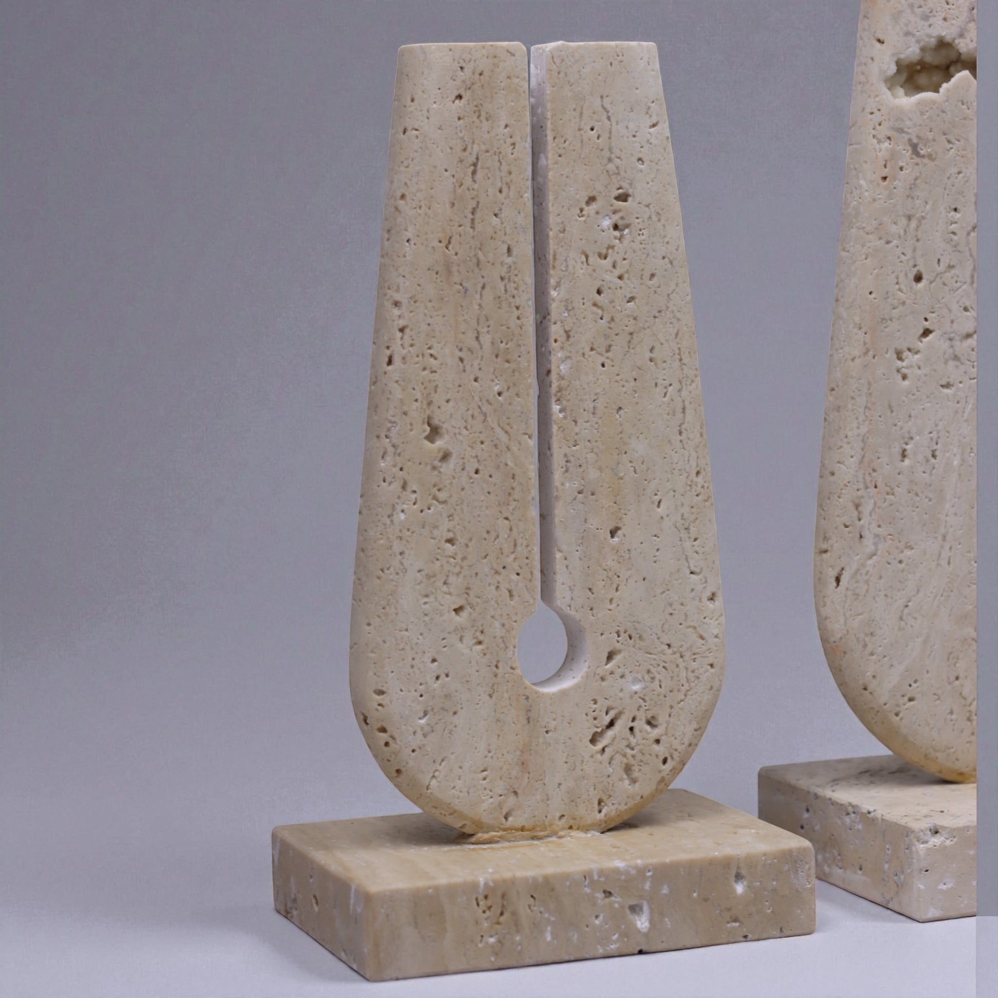 Dieses dekorative Set aus natürlichem Travertin verbindet organische Eleganz mit minimalistischer Formensprache. Die beiden Skulpturen, inspiriert von architektonischer Klarheit, symbolisieren Ausgewogenheit und Ruhe. Ideal als Blickfang auf Sideboards, Regalen oder als stilvolle Tischdekoration.