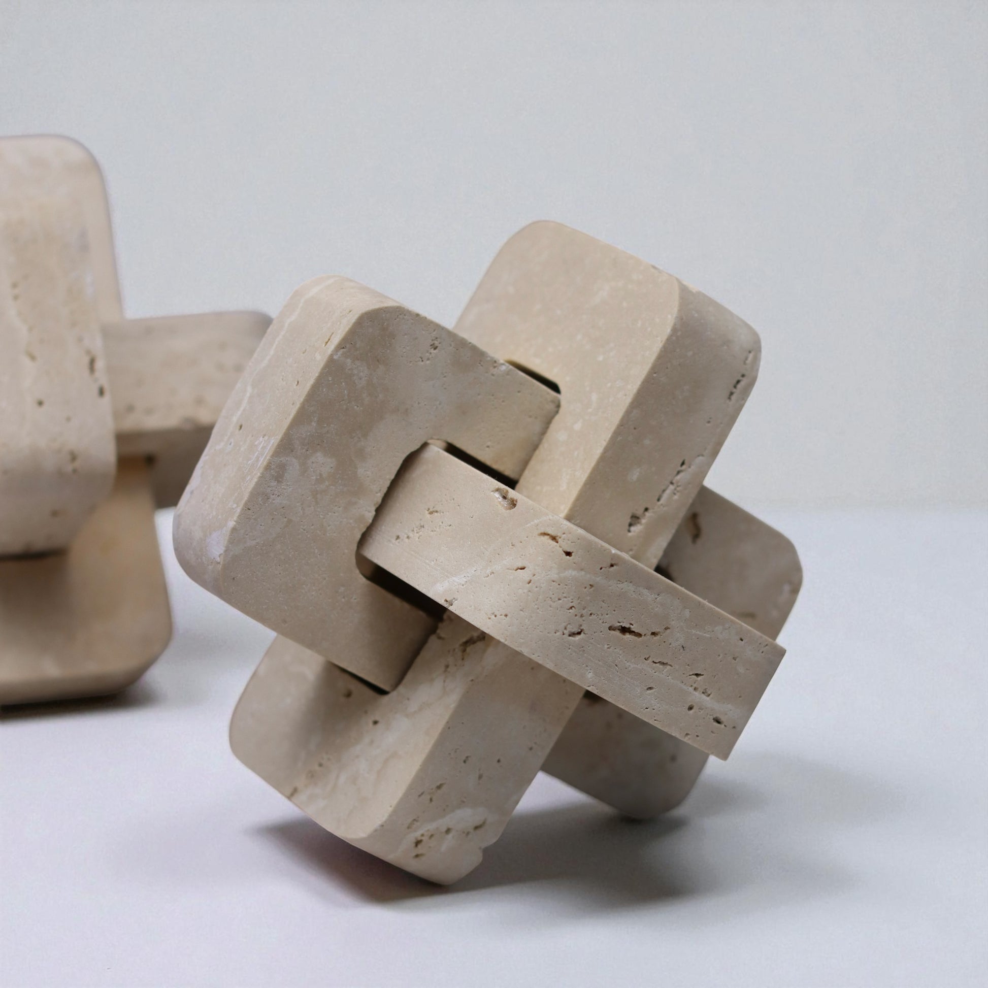 Bringe natürliche Eleganz und handwerkliche Perfektion in dein Zuhause mit dem Travertin Skulptur Set „Eternal Knot“.