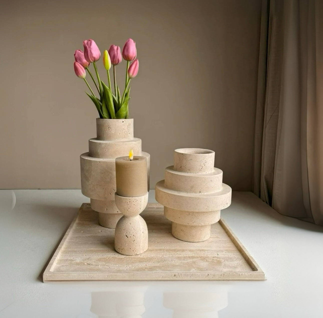 Unser handgefertigte Vasenset Terra Stairs aus naturbelassenem Travertin, beeindruckt mit seinem architektonisch inspirierten Stufendesign. Die markante Formgebung verleiht jedem Raum eine skulpturale Note. Ideal geeignet für Trockenblumen, Zweige oder als reines Designobjekt – ein Statement für alle, die minimalistischen Luxus und Naturmaterialien lieben. Jede Vase ist ein Unikat mit individueller Maserung und Farbnuance.