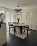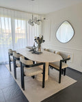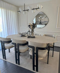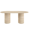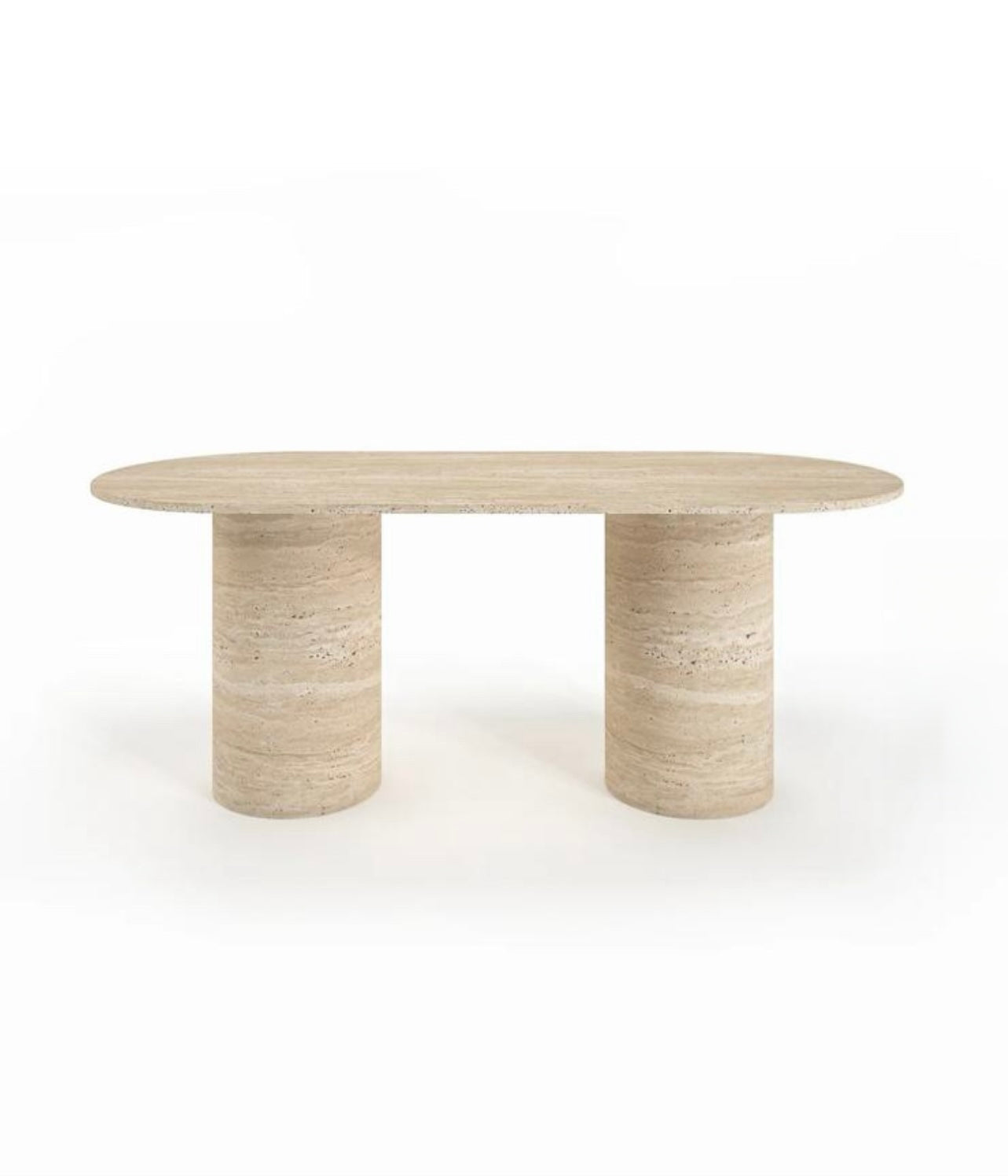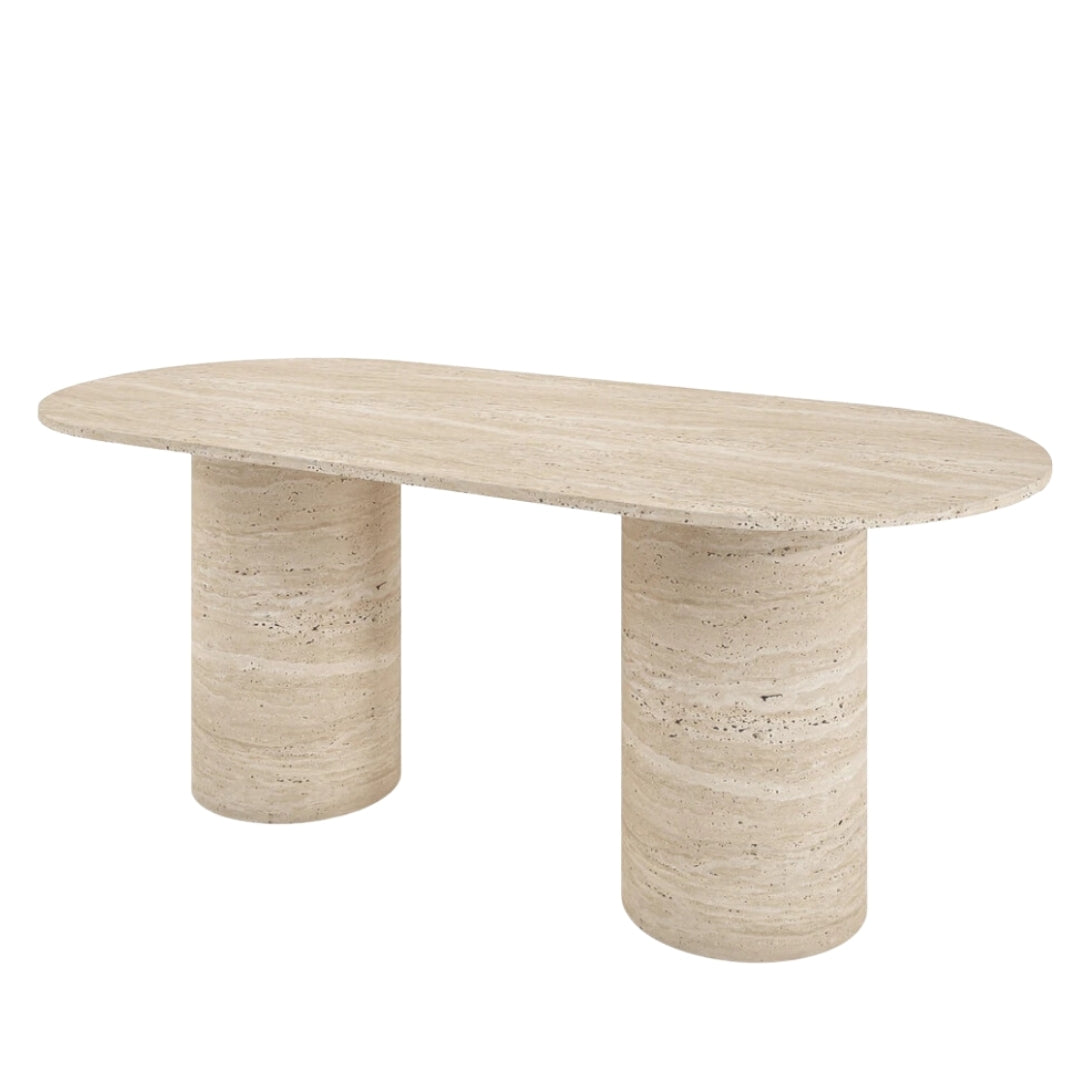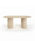 Der Verona Esstisch überzeugt mit seiner klaren formsprache und zeitlosen Eleganz. Die massiven zylindrischen Beine aus Travertin verleihen ihm eine kraftvolle Präsenz, während die ovale Tischplatte für eine harmonische Leichtigkeit sorgt.