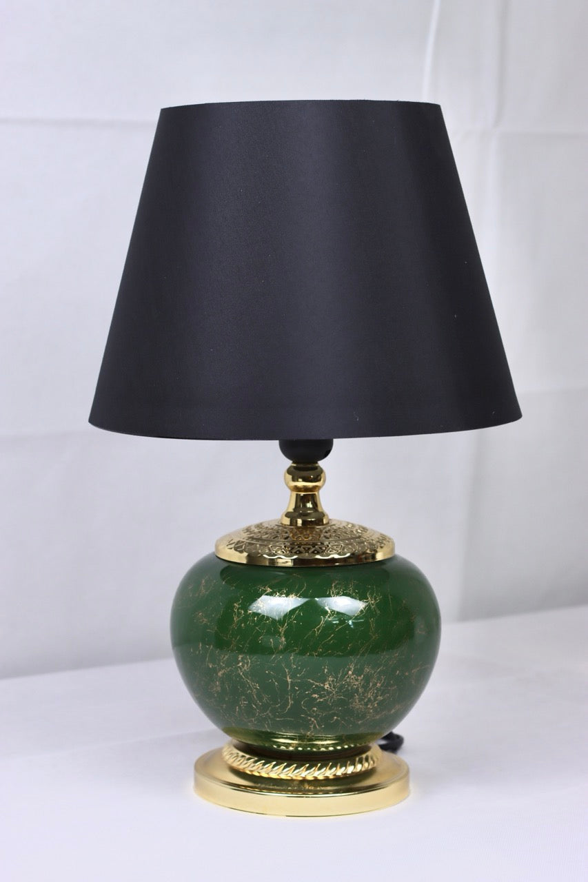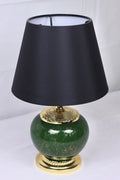 Die „Villa Toscana – Verde“ Tischlampen fangen die Atmosphäre eines italienischen Gartens bei Sonnenuntergang ein – mit sattem, edlem Tannengrün, durchzogen von feinen goldenen Maserungen, die an verwitterten Marmor erinnern. Der schwarze Schirm verleiht der Lampe eine besondere Tiefe und einen luxuriösen Kontrast, während goldene Elemente kunstvoll für Glanz sorgen.